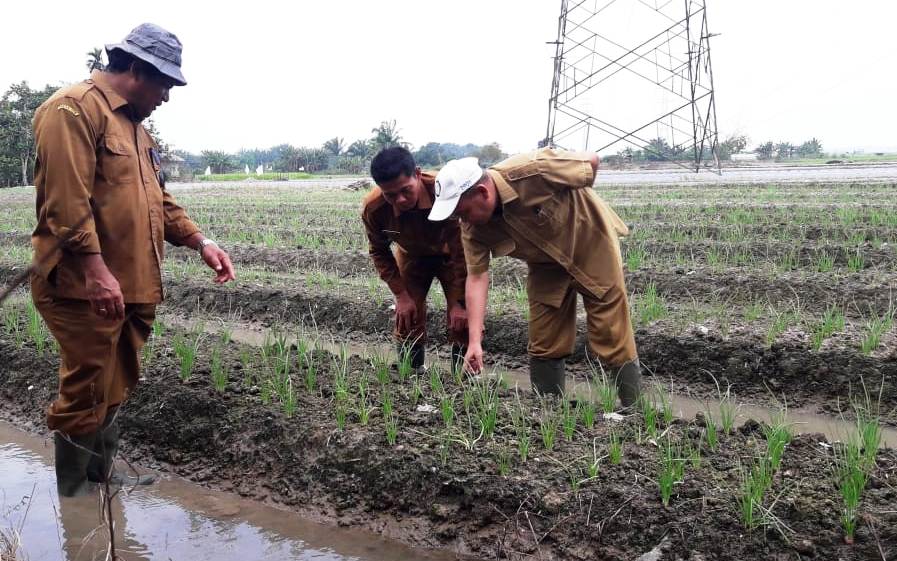 | Kepala UPTD PTPH Dinas TPH Provsu, Marino SP MM, memeriksa tanaman bawang merah berusia 14 hari dari serangan hama dan penyakit, Selasa (10/9/2019). Foto Fey |